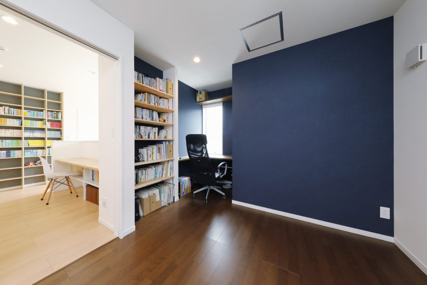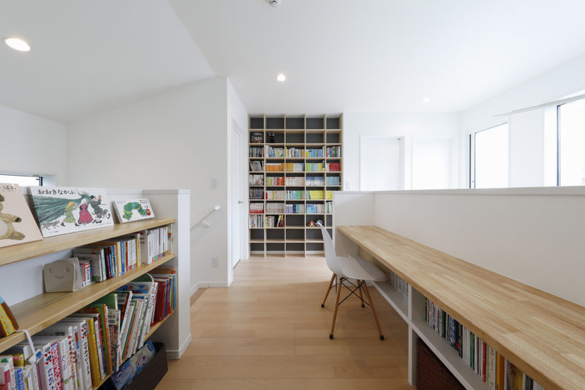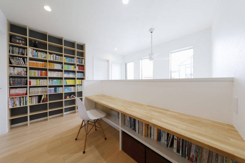 ・ホールには、作り付けの机・収納力のある本棚も備え書斎さながらの読書スペースにです。